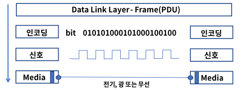 상위 계층인 데이터 링크 계층의 프레임을 신호로 인코딩하여 네트워크 장치로 전송