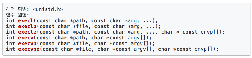 * v 계열 (execv, execvp) : 인자를 열거하는 방식이 배열형