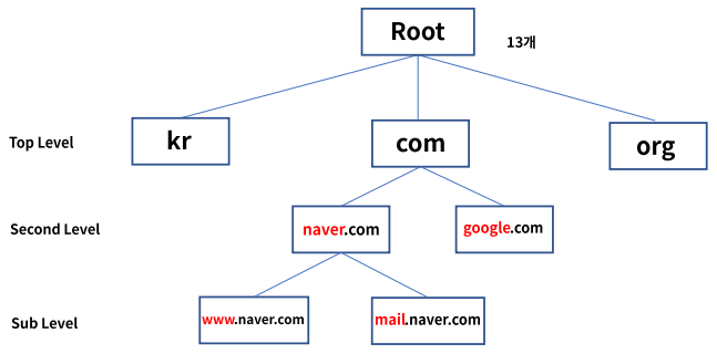 * DNS(Domain Name Service)는 도메인 주소를 IP 주소로 변환해주는 서비스이며 계층적 구조