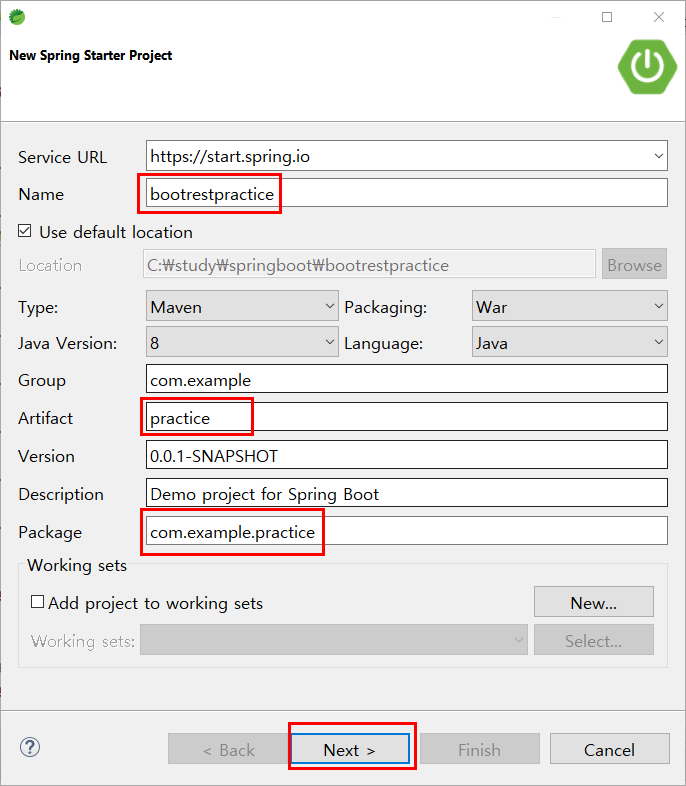Name, Artifact, Package의 이름을 설정 -> Dependency 추가하기 -> JPA, MySQL, Lombok 3 가지를 추가해주시면 됩니다 -> Finish -> 프로젝트 생성 완료
