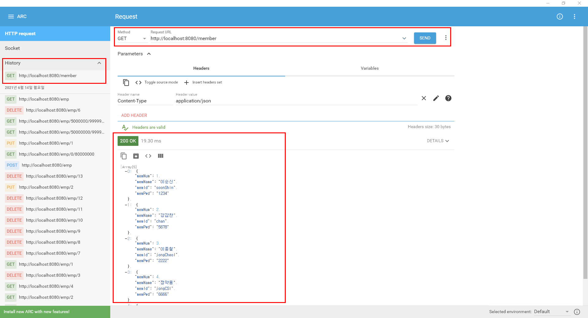 요청 URL은 localhost:8080/member가 될 것이며 GET 방식으로 요청을 하게 될 것 입니다