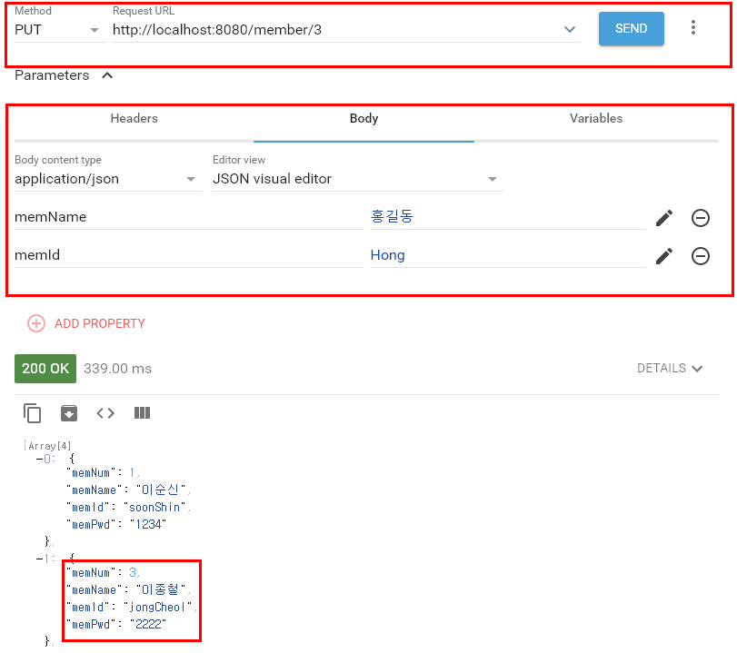 요청 메서드를 PUT 으로 변경하고 URL을 입력해주고 중간에 있는 Body를 클릭하시면 변경할 내용을 입력하는 창을 볼 수 있습니다