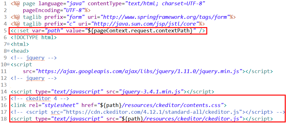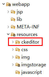 resources 안에 ckeditor 파일을 넣어준 뒤 ckeditor를 사용할 jsp 페이지에서 script로 넣어주시면 됩니다