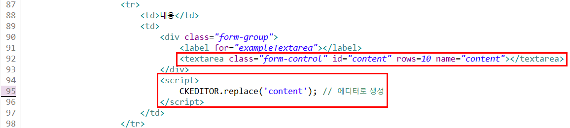 마지막으로 <textarea>태그를 작성해 주시면 CKEditor 적용 완료~!