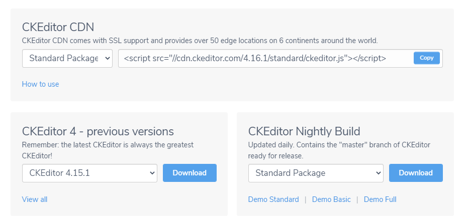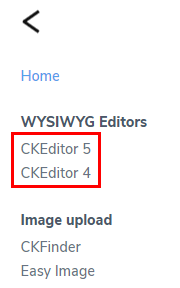 위 링크로 들어가서 왼쪽 상단에 있는 메뉴 버튼 클릭시 CKEditor 4, CKEditor 5 두 버전을 보실 수 있습니다.