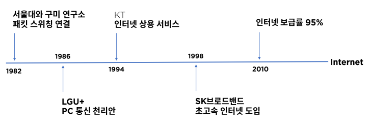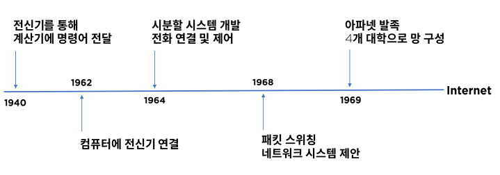 1969년 아파넷을 통한 대학교간 망 구성 -> 인터넷으로 진화