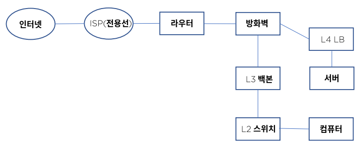 * ISP - 전용선 - 라우터 - 방화벽 - L3 백본 - L2 스위치 - 서버, 컴퓨터 - L4 로드밸런서 - DMZ