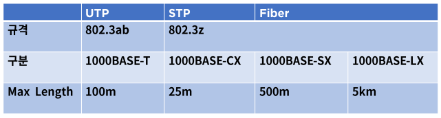 주로 쓰이는 1 Gigabit 이더넷 규격