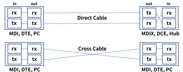 * Direct Cable (568B-568B) : PC to Hub -> DTE to DCE