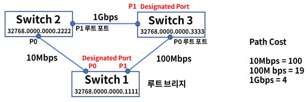 3. Switch 1 P0 & P1, 1Gbps 라인에서는 Switch 3 P1이 Designated Port로 선출