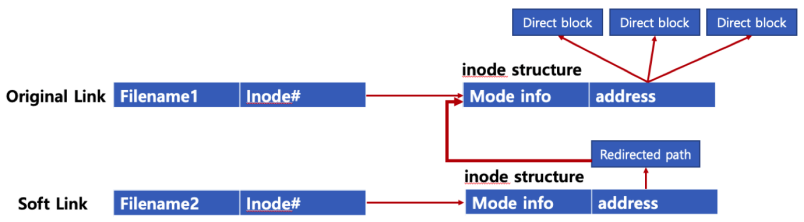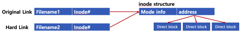 * 하드 링크: 동일 inode 가리키는 파일 이름만 하나 더 만듬