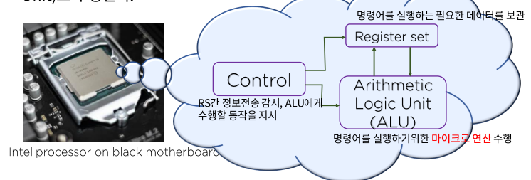 산술논리장치(ALU:Arithmetic Logic Unit) 그리고 제어장치 (Control Unit)로 구성된다.