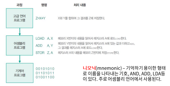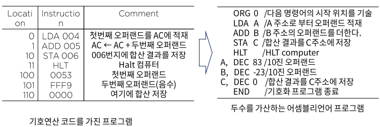 - 이진 코드 : 메모리상에 나타나는 형태의 명령어로서 이진수 명령어와 피연산자의 시퀀스이다