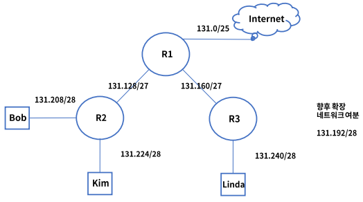 - 211.109.131.0/24를 7개 대역으로 분할 24_128, 26_64, 27_32, 28_16, 29_8, 4, 2
