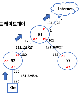 - 각 PC의 경로는 1개, 곧 자신의 대역을 제외하고 전부 인접한 라우터(게이트웨이)로 경로 설정한다. 보통 디폴트 게이트웨이만 설정한다
