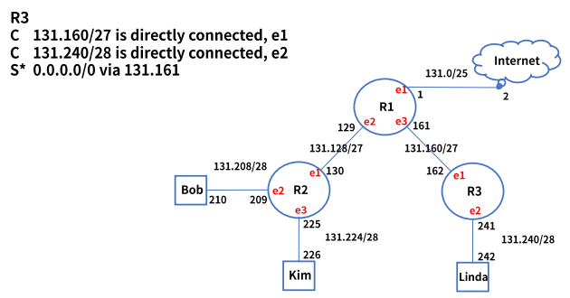 5. "S* 0.0.0.0/0 via 131.2"로 전달