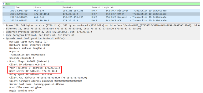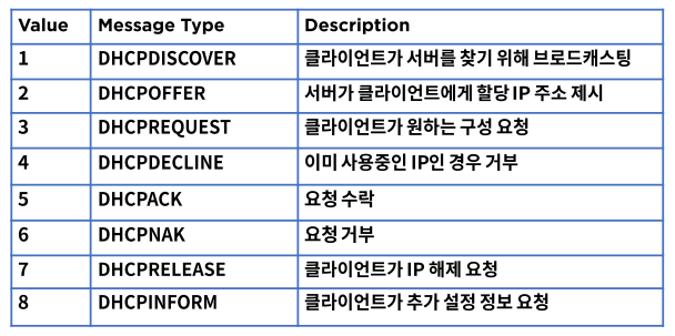 - Client IP : 최소 0.0.0.0, Your IP : 할당된 IP, Options : DHCP 메시지 타입 포함