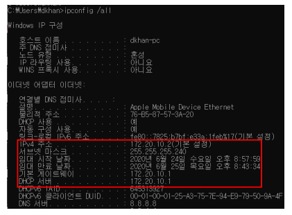 * DHCP 자동 할당 정보 : CMD > ipconfig /all