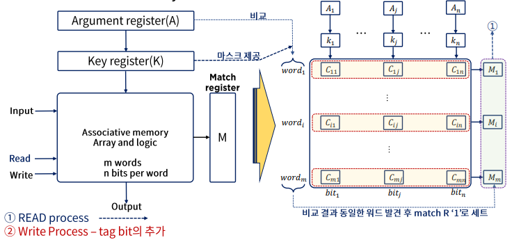 - associative memory는 각 셀이 저장 능력 뿐 아니라 외부의 인자와 내용을 비교하기 위한 논리회로를 갖고 있기 때문에 RAM보다 값이 비싸다. 다라서 탐색 시간이 필히 짧아야 하고 그것이 중요한 이슈일 경우 활용된다