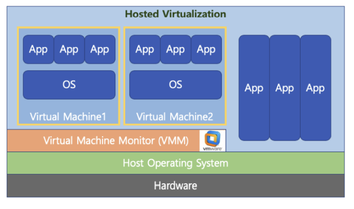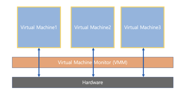 하이퍼바이저 또는 버추얼 머신 모니터 (VMM)라고 하는 소프트웨어가 Host OS 상위에 설치