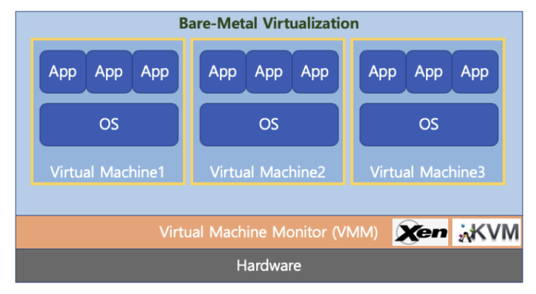 하이퍼바이저 또는 버추얼 머신 모니터 (VMM)라고 하는 소프트웨어가 Hardware에서 직접 구동