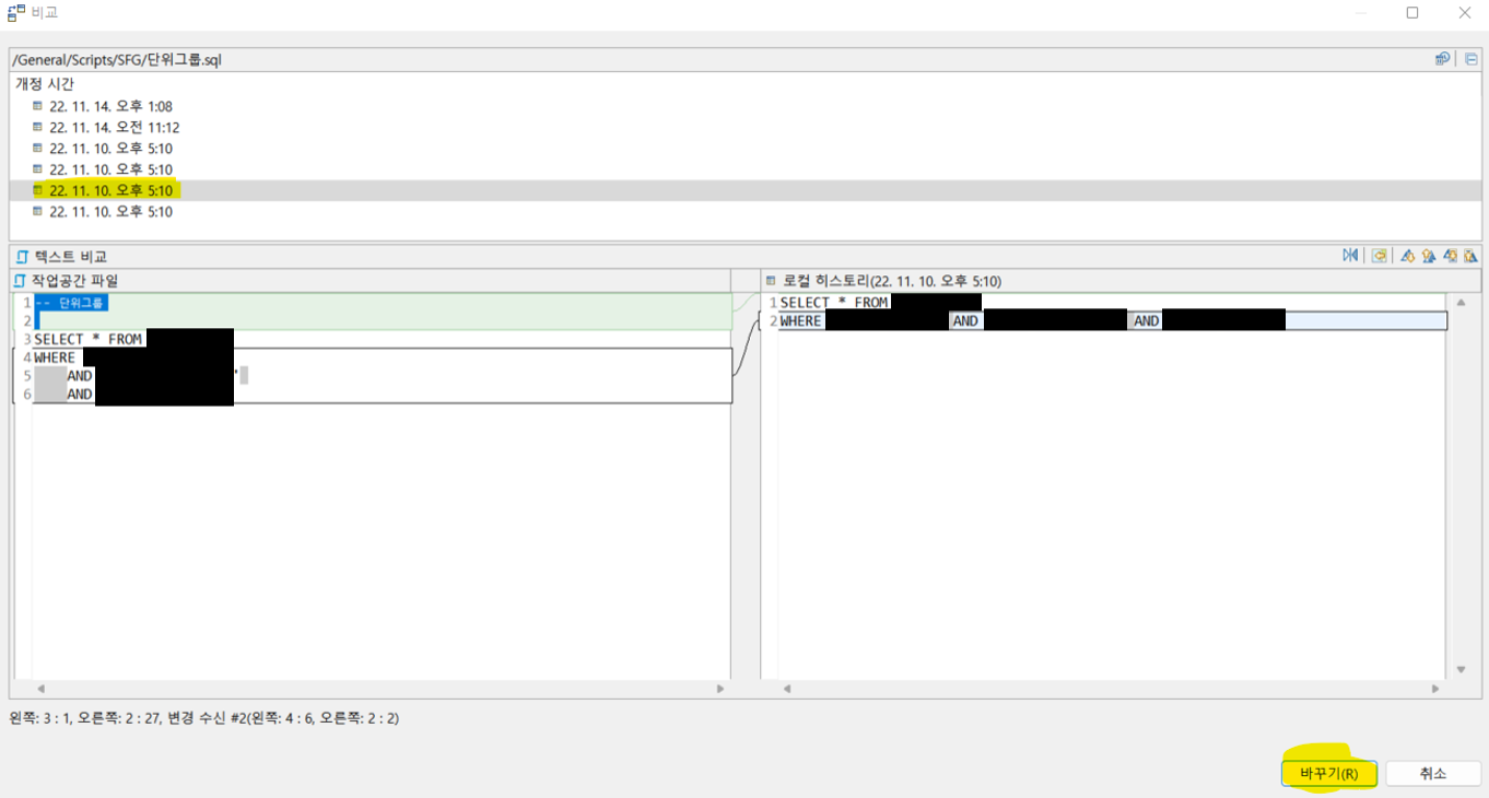 ② 상단 메뉴 : 현재 쿼리(좌)와 변경 전 쿼리(우) 비교