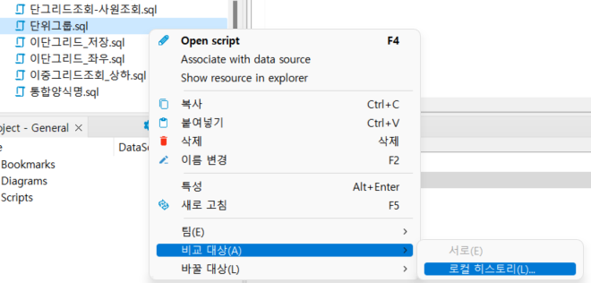 ① 내역을 보고 싶은 스크립트 우클릭 > 비교대상 > 로컬 히스토리 클릭