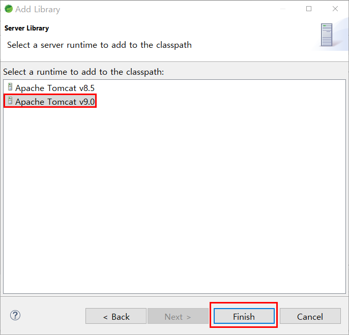 본인의 프로젝트에 맞는 Apache Tomcat 버전을 클릭후 Finish ->