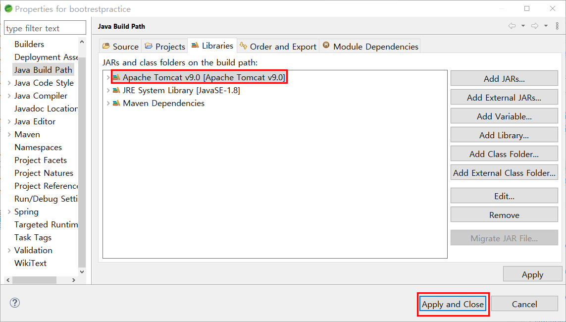 Java Build Path에 Apache Tomcat 라이브러리가 추가되어 있는 모습을 볼 수 있습니다
