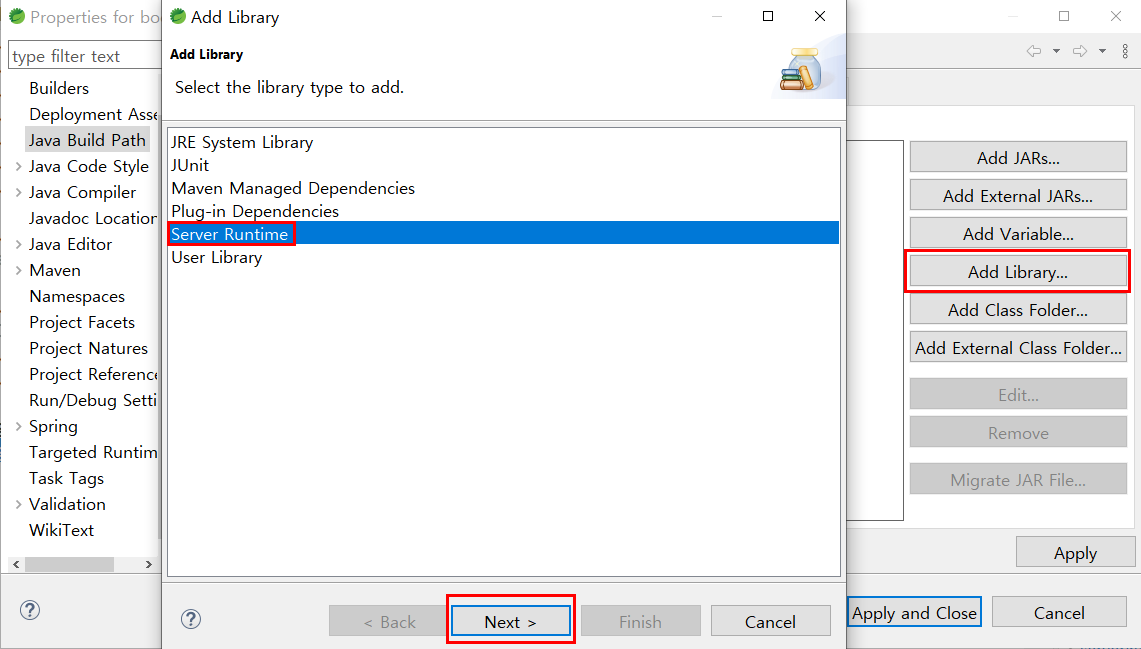 우측에 Add Library 클릭 -> ServerRuntime -> Next(다음)