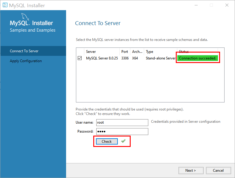 위에서 설정 했던 root 비밀번호를 입력 후 check를 통해 연결을 확인해주세요
